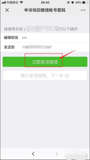 9、输入手机号码后,编辑短信立即发送至指定的号码,然后点击“我已发送短信,下一步”。如图所示:
