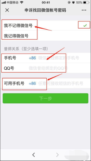 8、如若不记得微信号,“至少选填一项”,曾绑关系的手机号或者是可用手机号。