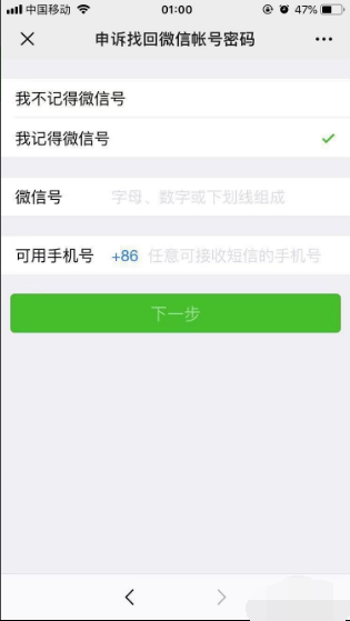 7、申诉找回微信帐号密码有两种选项:“我不记得微信号”和“我记得微信号”;若记得微信号,直接输入微信号和可用手机号,进行下一步的验证。如图所示: