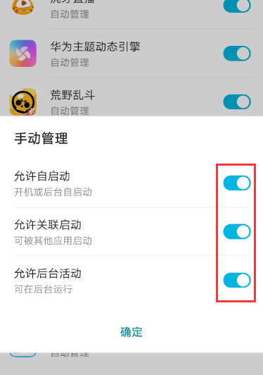 八、弹出的拖动管理内,把“允许自启动”、“允许关联启动”、“允许后台活动”三个开关全部打开,点击“确定”即可。经过上面步骤设置后,微信就可以在锁屏和切换至后台后依然能够接收到消息。
