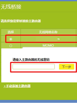 6、在无线信号扫描结果中,找到并选择“主路由器”的无线信号,输入主路由器无线密码。