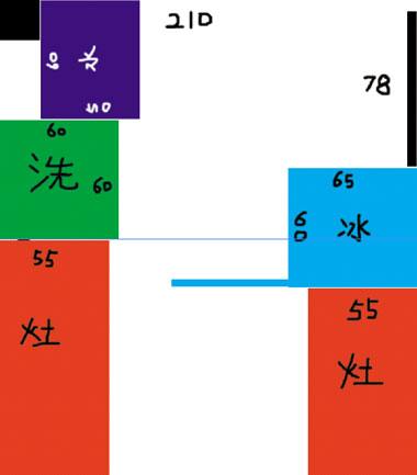 我发现早起和k3487971两位画的图有点比例失衡,如果把实际的东西放进去肯定不会剩那么大的活动空间。我这张图实际比例应该刚刚好,冰箱,洗衣机,炉台我都是量的我自己家的,实际不会差多少。 水盆建议你用不锈刚的,那样实用面积大。 黑色的水管下面,你可以挂镜子和洗漱用品应该很方便。窗户上你还可做个小架子放些油盐酱醋。右边的炉台已经有90多公分了,操作会很方便。15公分的那个水管可以忽略了。 有管道煤气当然还是用煤气吧。用电做出来的东西,,,,味道还是有所欠缺。我自己感觉我设计的还说的过去,起码不会有多余的死角.