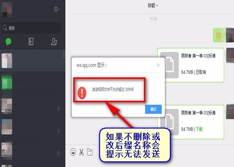 4、发送视频文件必须改后缀名称,否则会提示“发送视频文件不能超过20M”;