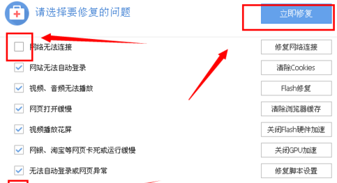 5、勾选”网络无法连接“,”页面显示错码“和”页面打不开“等选项后,再点击”立即修复“。重新打开浏览器后可以尝试登陆微博,看看是否已经修复。但是要注意,修复后浏览器皮肤等设置会恢复到默认状态,再重新设置一下即可。