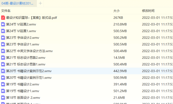 ?pwd=zxcv 提取码:zxcv04期-最设计素材2018【某痕】版式设计新课程|最设计知识星球–【某痕】版式设.pdf|第24节 VI延展2.wmv|第24节 VI延展1.wmv|第23节 字体设计2.wmv|第23节 字体设计1.wmv|第22节 中英文字体设计方法.wmv|第21节 标志设计思路2.wmv|第21节 标志设计思路1.wmv|第20节 书籍设计案例示范2.wmv|第20节 书籍设计案例示范1.wmv|第19节 书籍设计2.wmv|第19节 书籍设计1.wmv|第18节 版面设计 2.wmv|第18节 版面设计 1.wmv