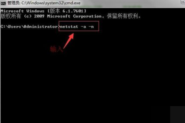 2、弹出【命令提示符】对话框,在弹出的【命令提示符】对话框中,输入“netstat -a -n"命令。
