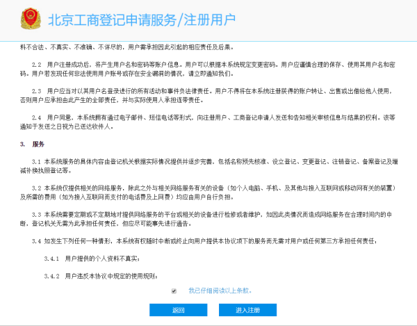 2.出现注册协议,选中“我已仔细阅读以上条款”;
