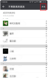 第五步点击进去之后,就可以看到不常联系的朋友,点击上方的多选,如下图所示: