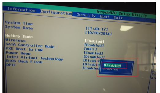 重启之后系统自动进入bios界面,在这个界面可以看到有information、configuration、security、boot、exit五个菜单,进入第二个菜单(按键盘“→”进入)。