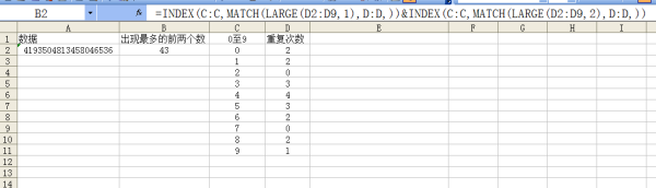 这样C列,C1是出现最多次的数依,C2是出现第二多的次的数,这样依次排下来(出现次数相同多的以数据中排前的先显示,如你举例的数据3和5出现次数相同,而3先出现,所以3排在前面)
