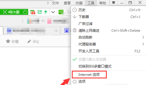 3,然后在【工具】选项的下拉菜单里面选择【Internet选项】。