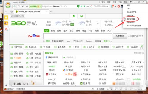 1、打开360安全浏览器,点击右上角的帮助,选择修复浏览器。