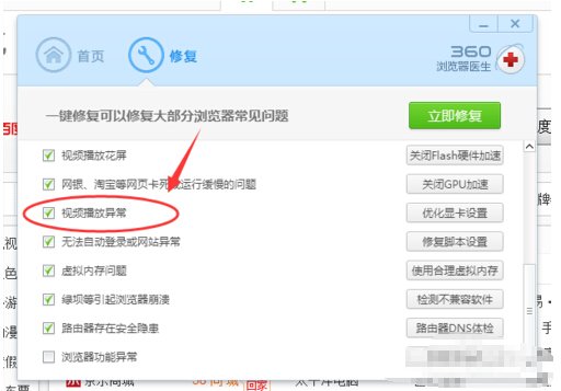 2、然后根据自己的问题情况选择修复的内容,比如笔者的是视频播放问题,点击立即修复。不过,为了更好的解决问题,建议修复全部选项。