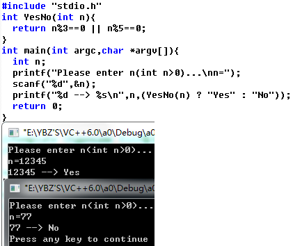 C语言:编写函数YesNo(int n),判断n是否为3或5的倍数,是返回1输出Yes,否则返回0输出No。咋写?