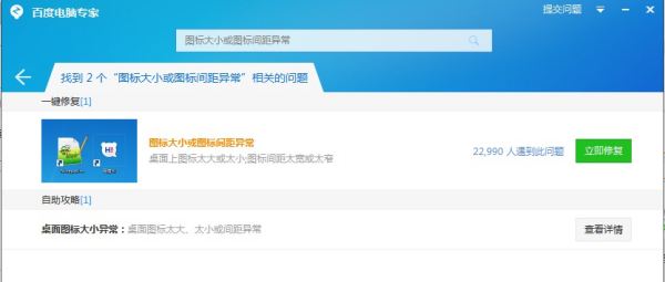 2、打开百度电脑专家,在搜索栏上输入图标大小或图标间距异常,按回车键;