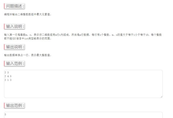 编程并输出二维整数数组中最大元素值输入第一行是整数m,n 表示该二维数组有m行n列组成 m行数据 每行n个整数 m,n的值大于等于1小于等于10 每个整数都不超过C语言中int类型能表示的范围输出数据单独占一行 表示最大整数值【提问】