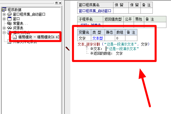 2、引入精易模块,添加“文本_逐字分割”命令,命令第一个参数为需要获取的文本,第二个参数为返回文字的数组: