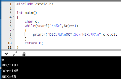 printf("DEC:%d\nOCT:%o\nHEX:%X\n",c,c,c);