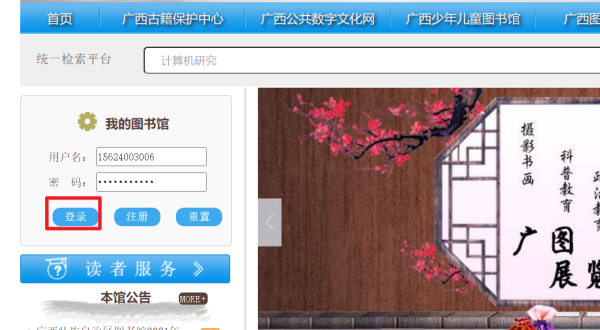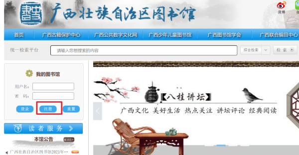 1、首先进入广西壮族自治区图书馆的官方网站,找到“注册”选项,如图所示。