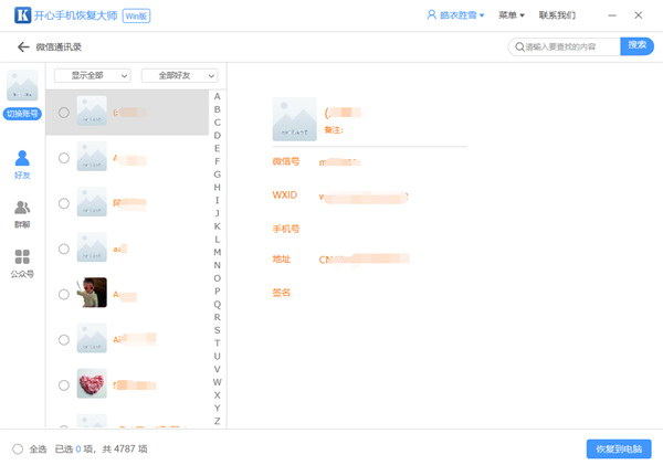 完成后橙色字体显示的就是我们删除的微信好友了,勾选需要找回的好友,再点击右下角的“恢复到设备”或“恢复到电脑”均可。