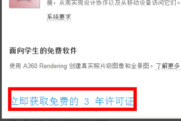 4、选择“AutoCAD”点击,弹出“适用于学生和教师的免费软件下载”的页面,可以看到“面向学生的免费软件”以及“立即获取免费的 3 年许可证”的字样。