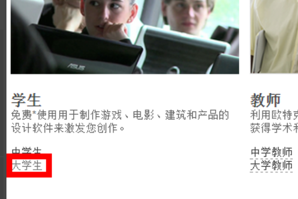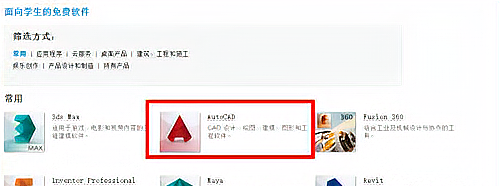 3、点击“大学生”,然后再弹出的新网页中可以看到AUTODESK旗下很多的软件,当然这些和AutoCAD一样可以免费使用的哦,选择“AutoCAD”。
