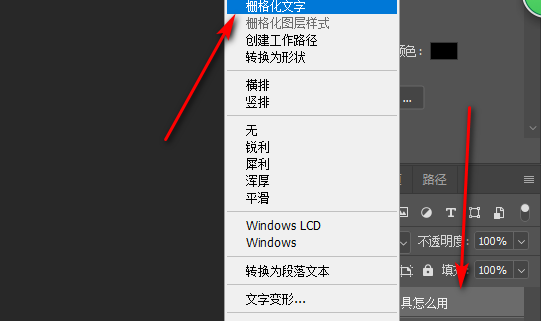 2、点击文字工具后,选中文字图层点击栅格化文字。