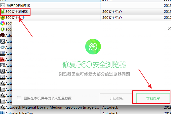 4、找到“360安全浏览器”选项,双击打开,然后点击“立即修复”即可。