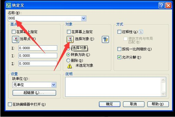2、然后会弹出一个块编辑器,输入块的名称,然后再点击“选择对象”: