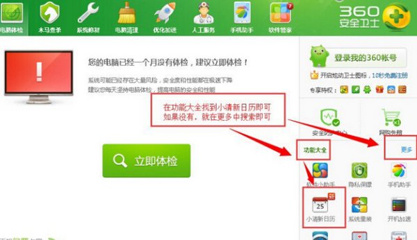 打开360安全卫士,在【功能大全】可以找到,如果没有,就点击更多,在里边搜索小清新日历就可以了。
