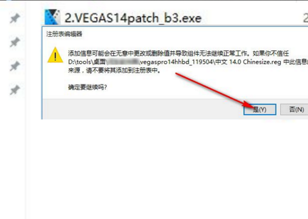 3、击打开以后提示您将汉化的补丁添加到vegas pro软件上,点击确定: