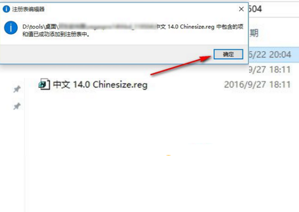 4、此时会提示,reg文件中包含的数值已经成功添加到注册表中,无需理会点击确定即可完成汉化: