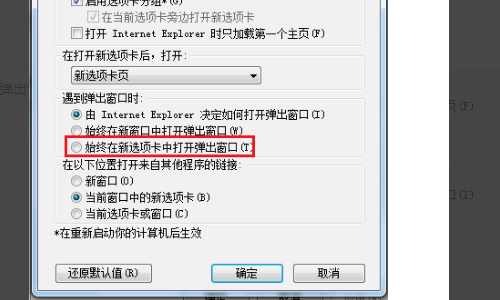 5、点选始终在新选项卡中打开弹出窗口。