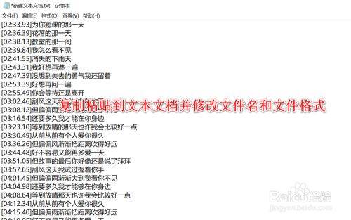 复制文字之后,我们打开一个空白的文本文档,然后粘贴,并将文件名称和格式进行修改,扩展名修改为lrc格式,名称修改与音频一样。