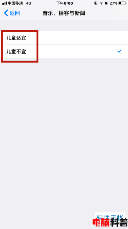 6. 我们也可以在内容访问限制界面对软件进行不同分类,可以自己设置,比如我们可以设置【儿童是否适宜】,我们添加桌面的应用跟上述的步骤相似,如图。