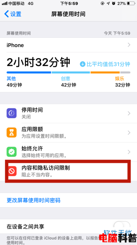 2. 之后在列表中点击【内容和隐私访问限制】,如图。