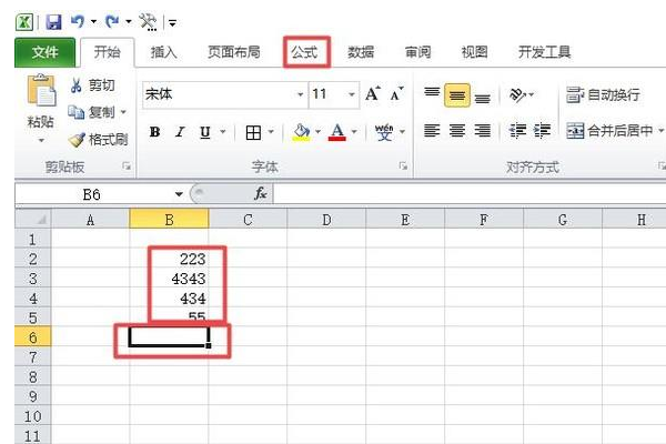 1、首先,我们打开excel,然后我们输入一些数字,之后我们选中图示中的单元格,然后点击公式;