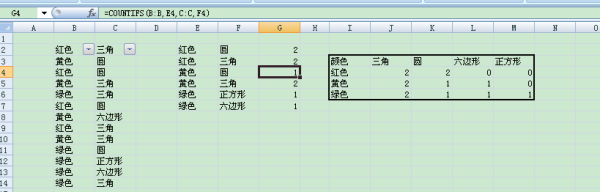 I3:M6是我依你的条件重新写的一个表,这样会很清楚也不容易出错,在做之前只需要把颜色列的不重复项放到I4到I6列,把形状的不重复项放到J3到M3行就行啦,J4:M6=COUNTIFS($B:$B,$I4,$C:$C,J$3)。