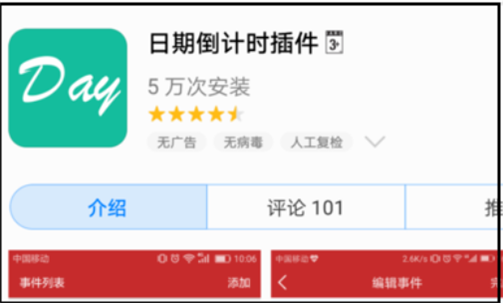 1、首先在手机软件市场找到“日期倒计时插件”,然后下载成功。