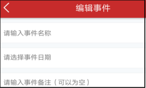 3、界面中可以看到“事件名称”、“事件日期”以及“事件备注”,输入主要的信息都编辑好之后,回到主界面,就可以看到一个编辑好的事件了。