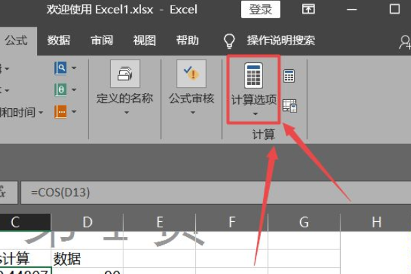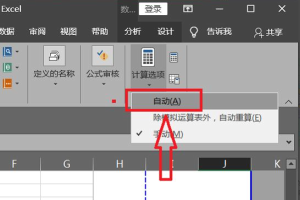 4、找到【计算选项】功能。点击调出选择面板后,根据需要选择【自动】或者【手动】。如果需要自动更新,则选择【自动】。