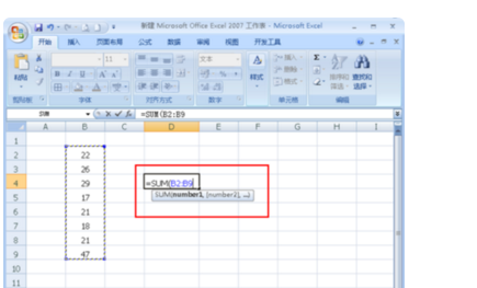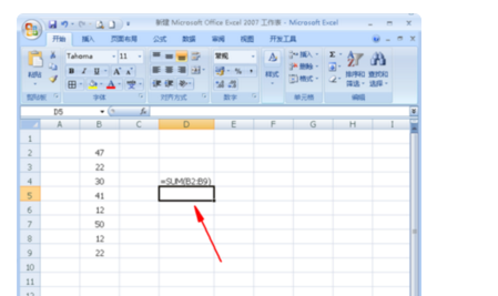 2、下面计算这组数据的和,在单元格输入公式“=SUM(B2:B9)”(如图);