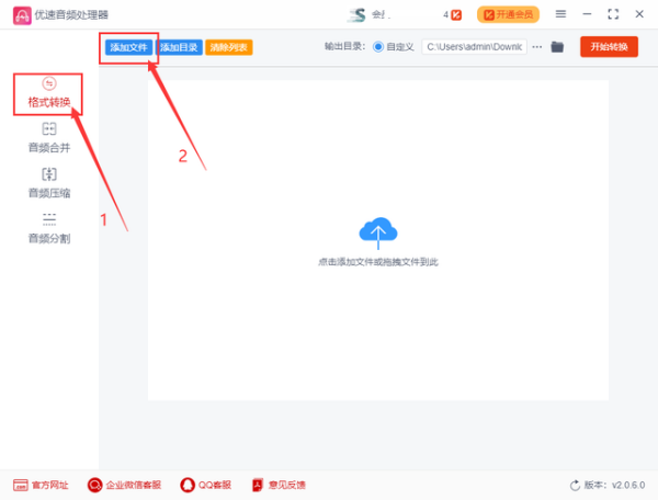 步骤1,下载好优速音频处理器后安装打开,点击界面左边最上面的【格式转换】功能,将mp4文件拖入到软件中,也可以点击【添加文件】按钮将mp4文件添加到软件中。