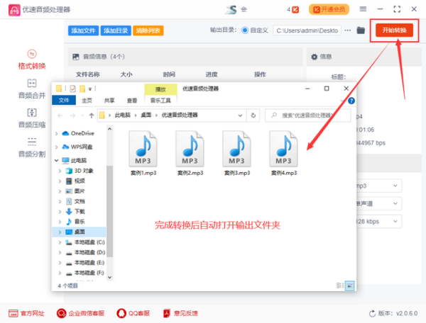 步骤3,上面的设置完成后,点击右上角的【开始转换】按钮启动格式转换,稍等片刻当完成转换后,软件会自动打开输出文件夹,方便查看转成的mp3文件。
