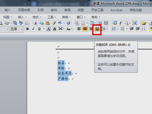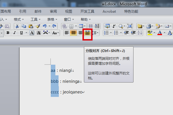 1、选中Aa,单击格式工具栏上的分散对齐按钮,如图所示;