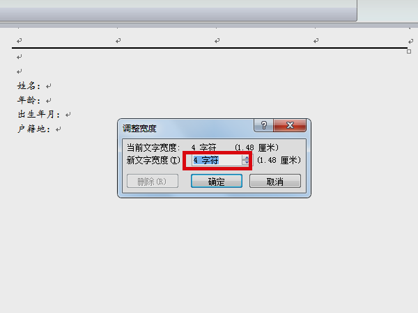 4、然后在出现的对话框中,将新文字宽度设为“4字符”,因为冒号前文字最长的就是4个字符。