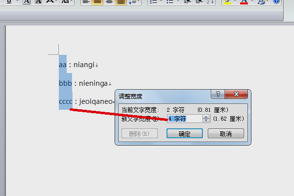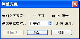 2、在弹出的调整宽度对话框,的新文字宽度处输入2,如图所示;