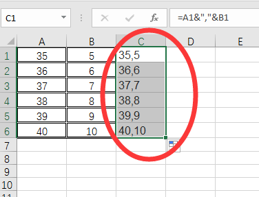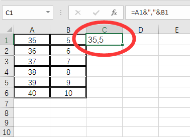 2、在c1单元格中输入合并公式:=A1&","&B1,需要在英文输入法中输入双引号。