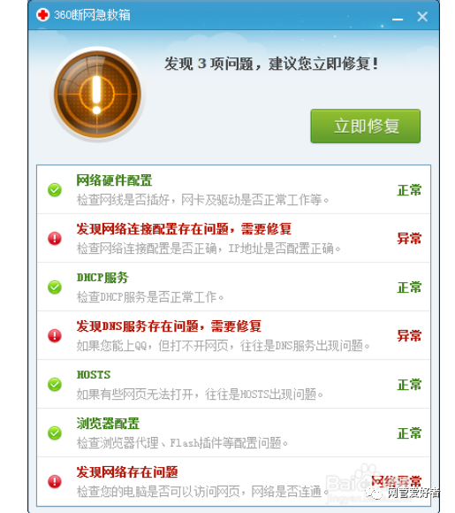 从打开的“360断网急救箱”工具主界面中,点击“全面检测”按钮,此时工具将自动检测并显示有关导致计算机断网的原因。如图所示: