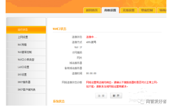 7、同时还可以通过“路由器”Web管理界面来查看网络连接情况,切换到“高级设置”-“运行状态”选项卡,在此就可以查看导致电脑无法正常上网的具体原因了。